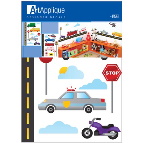 Cars, trucks, a firetruck, a school bus and even a helicopter make their way on a road that grounds this brightly colored design. Also included are detail pieces that add to the transportation theme to make your little boy's decor a complete and busy scene! The playroom photo above shows only about half of the designs you get in the On the Road Transportation design pack pictured in the inset. Simply peel these colorful decals from the backing and press to your wall. Pieces are removable and repositionable.